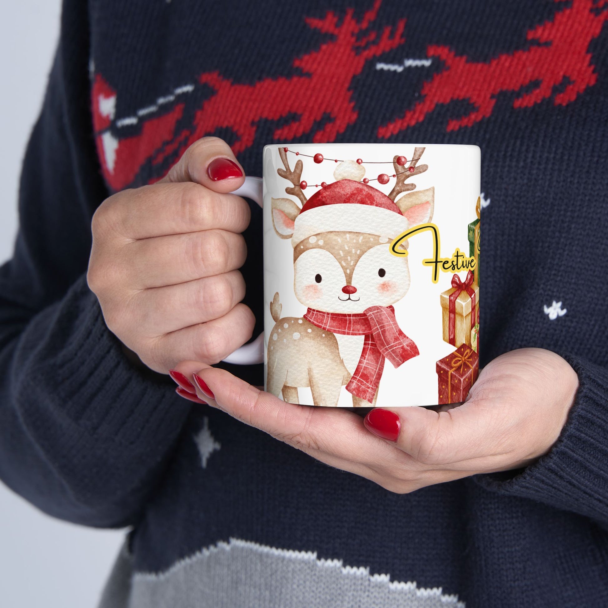 Featuring an adorable reindeer in a cozy scarf, surrounded by festive gifts and soft winter colours, this mug instantly adds warmth to your holiday mornings.