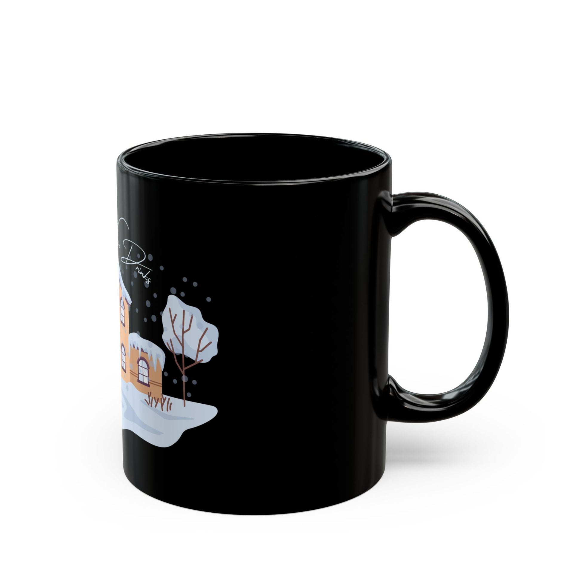Steam rises from a warm cup as soft snow falls outside the window. This glossy black ceramic mug carries a cozy winter scene — a snow-covered cottage glowing against a dark background — that feels like an evening spent indoors with good company. The wide C-handle sits comfortably in your hand while you sip coffee, tea, or cocoa. Durable printing keeps the colors bright, and the microwave- and dishwasher-safe finish makes this mug an easy everyday companion for someone who treasures quiet, hygge moments during the colder months.