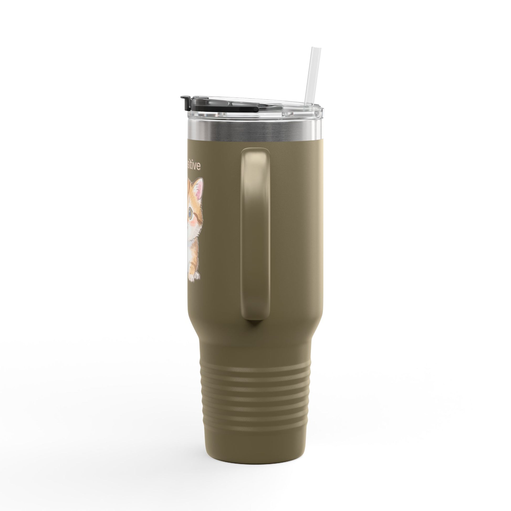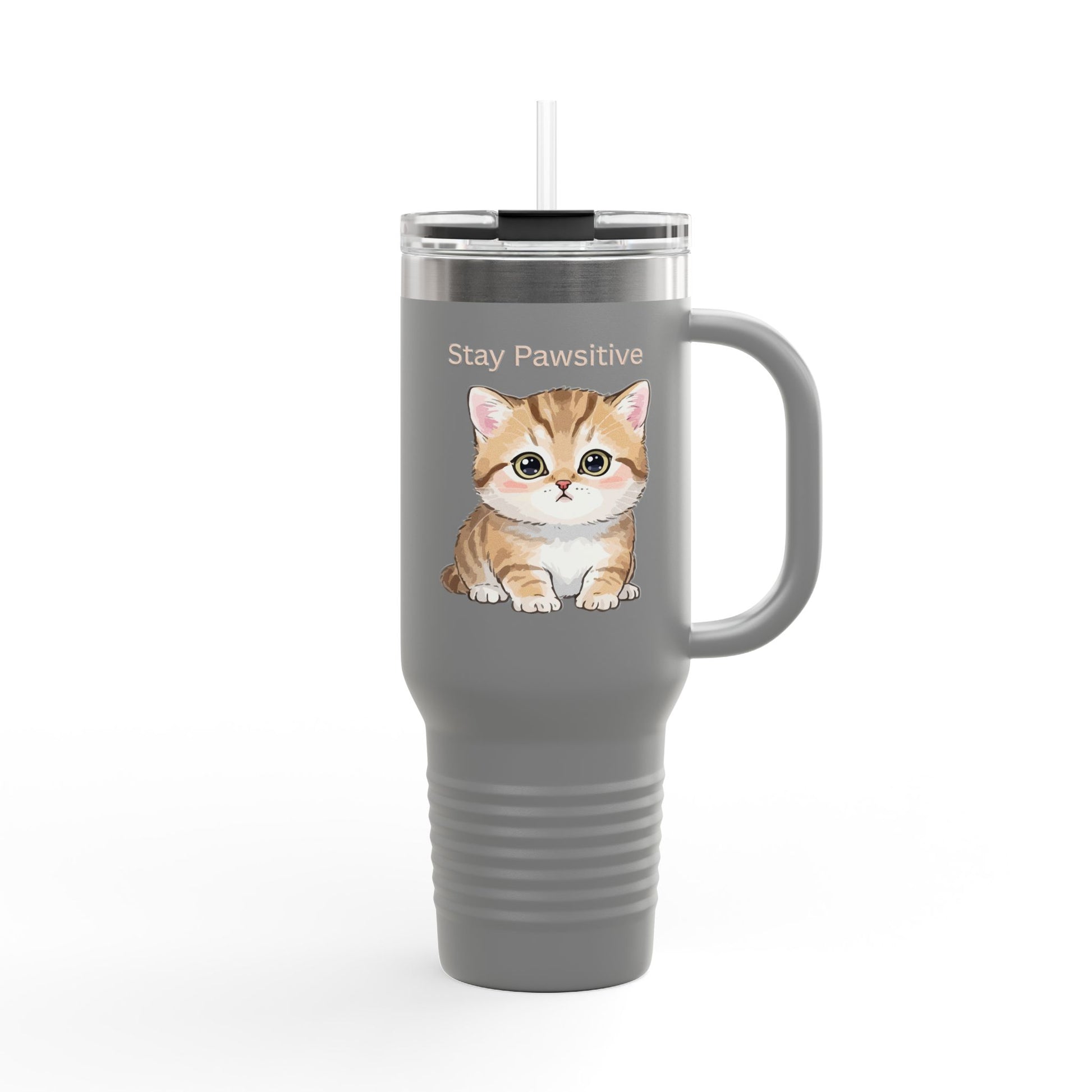 The soft, wide-eyed kitten illustration paired with the playful quote “Stay Pawsitive” makes this tumbler the perfect feel-good accessory for work, travel, gym days, or quiet mornings at home.